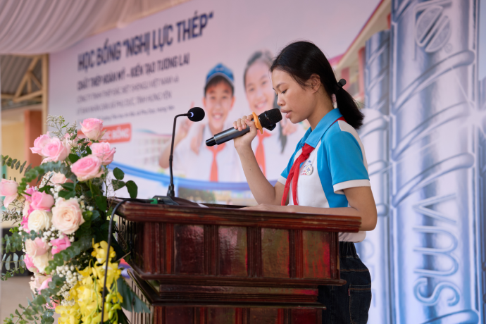 Em Nguyễn Thị Mai Thanh - đại diện cho các học sinh được nhận học bổng đã bày tỏ sự xúc động và biết ơn sâu sắc trước sự quan tâm của doanh nghiệp và thầy cô. Những suất học bổng này đã tiếp thêm sức mạnh giúp các em vững tin, hun đúc ý chí và nghị lực như chính tên gọi của chương trình “Nghị lực thép”.