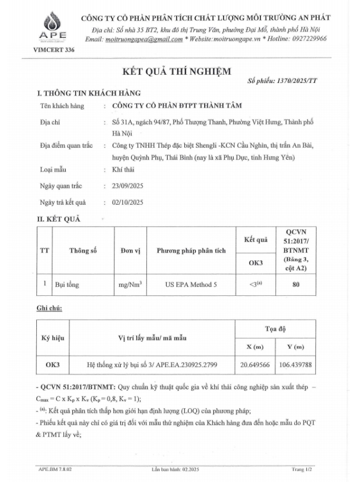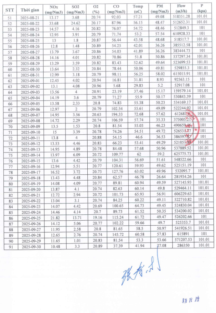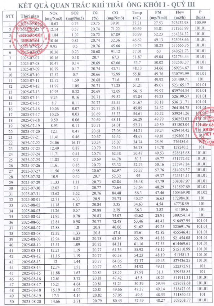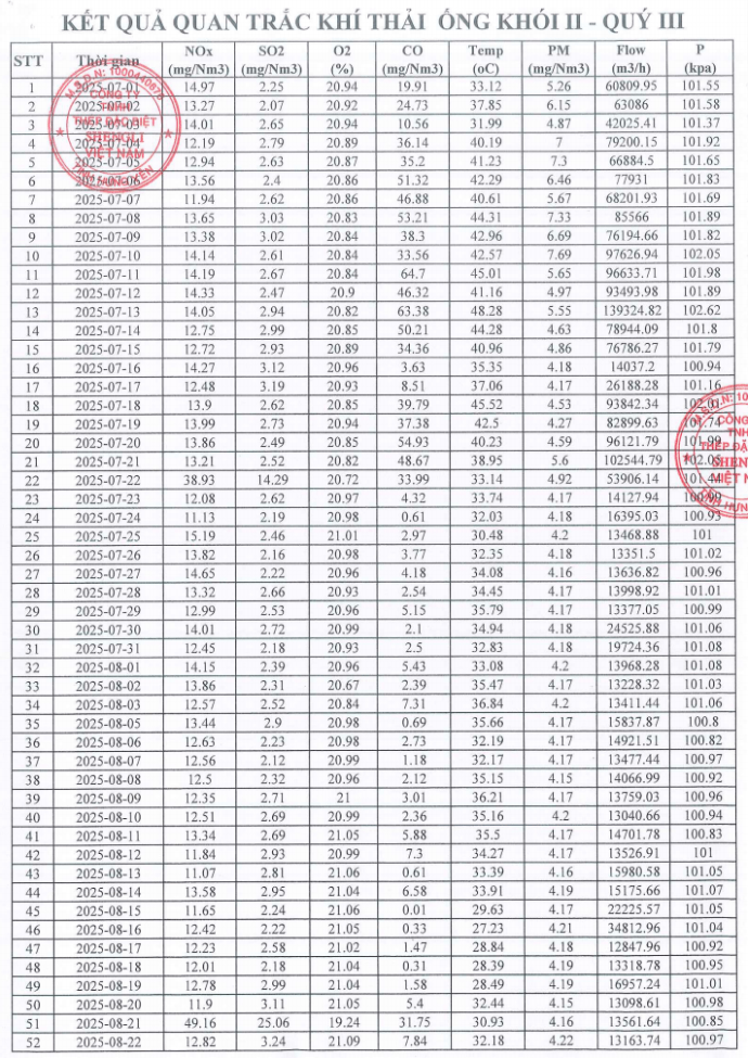 KẾT QUẢ QUAN TRẮC KHÍ THẢI QUÝ 3 NĂM 2025