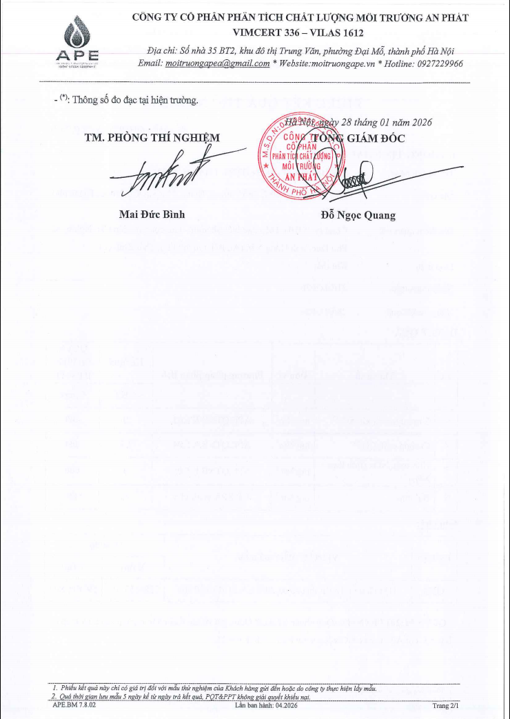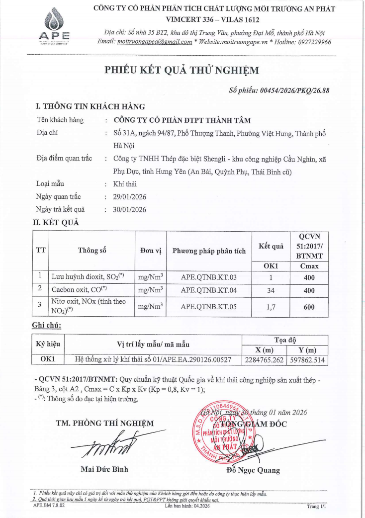 KẾT QUẢ QUAN TRẮC QUÝ I.2026 CỦA ỐNG KHÓI 1, 2